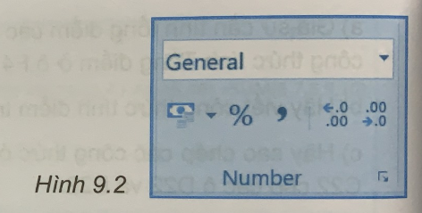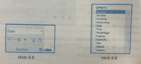 9.9. Để định dạng các ô có dữ liệu kiểu ngày tháng, Minh chọn các ô đó rồi nháy chuột vào nút nhỏ phía dưới bên phải nhóm lệnh Number (Hình 9.8) để mở cửa sổ Format Cells