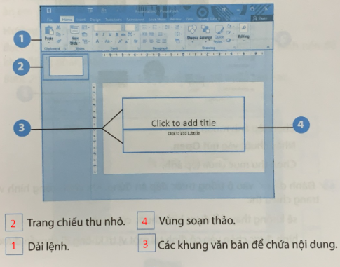 Câu 2. Hãy quan sát màn hình làm việc của phần mềm trình chiếu và điền số vào ô trống tương ứng với tên các thành phần