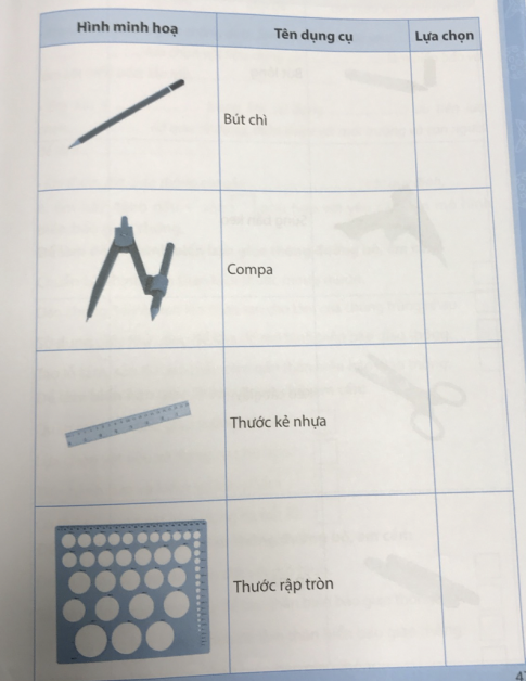 Lựa chọn: bút chì, thước kẻ nhựa, thước rập tròn, bút lông, kéo cắt giấy.