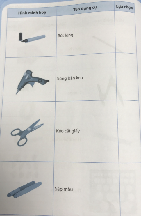Bài 4: Em chọn những dụng cụ nào trong bảng dưới đây để làm biển báo giao thông ở bài tập 2? Hãy đánh dấu V vào cột lựa chọn .