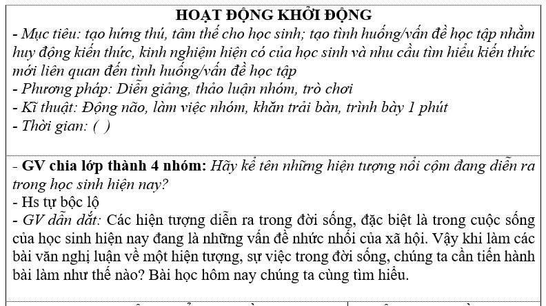- GV dẫn dắt: Các hiện tượng diễn ra trong đời sống, đặc biệt là trong cuộc sống của học sinh hiện nay đang là những vấn đề nhức nhối của xã hội. Vậy khi làm các bài văn nghị luận về một hiện tượng, sự việc trong đời sống, chúng ta cần tiến hành bài làm như thế nào? Bài học hôm nay chúng ta cùng tìm hiểu.