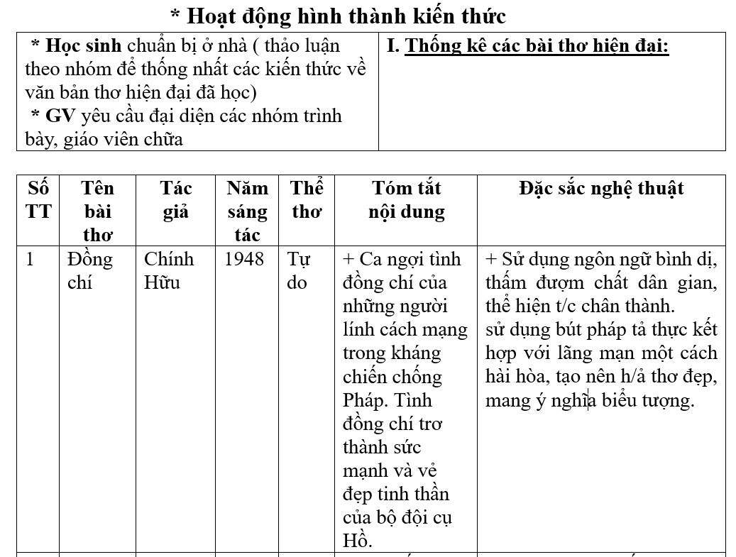 * Học sinh chuẩn bị ở nhà ( thảo luận theo nhóm để thống nhất các kiến thức về văn bản thơ hiện đại đã học) * GV yêu cầu đại diện các nhóm trình bày, giáo viên chữa |