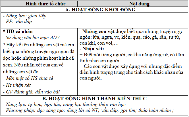 - GV đánh giá, dẫn vào bài - Những con vật được biết qua những truyện ngụ ngôn: lừa, ngựa, ve, kiến, quạ, cáo, gà, rắn, sư tử, con khỉ, con voi,…