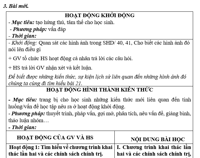 - Mục tiêu: trang bị cho học sinh những kiến thức mới liên quan đến tình huống/vấn đề học tập nêu ra ở hoạt động khởi động.