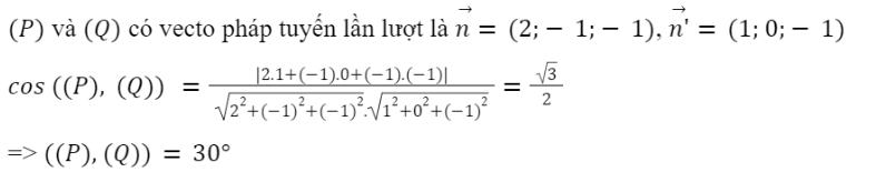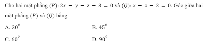 Cho hai mặt phẳng (P): x - y - 6 = 0 và (Q). Biết rằng điểm H(2;-1;-2) là hình chiếu vuông góc của gốc toạ độ O(0;0;0) xuống mặt phẳng (Q). Tính góc giữa mặt phẳng (P) và mặt phẳng (Q).