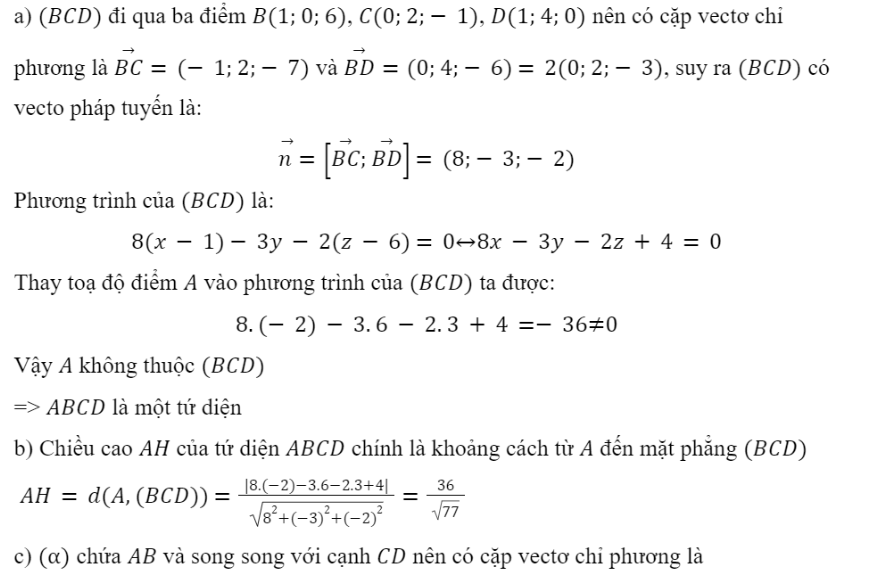 a) Viết phương trình mặt phẳng (BCD). Suy ra ABCD là một tứ diện.