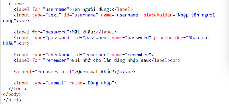 Câu 1: Bổ sung mã lệnh HTML vào tệp login.html để thêm các thành phần nhập liệu sau: