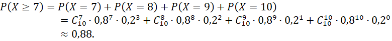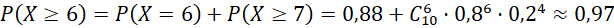 Vào đầu mùa đông, trang trại A lắp mới 10 bóng đèn để sưởi ấm cho gà. Các bóng đèn hoạt động độc lập với nhau và sẽ được bật liên tục trong mùa đông. Bóng bị hỏng không được thay thế. Xác suất không bị hỏng trong cả mùa đông của mỗi bóng đều bằng 0,8. Đàn gà sẽ đủ ấm nếu có ít nhất 7 bóng đèn hoạt động.