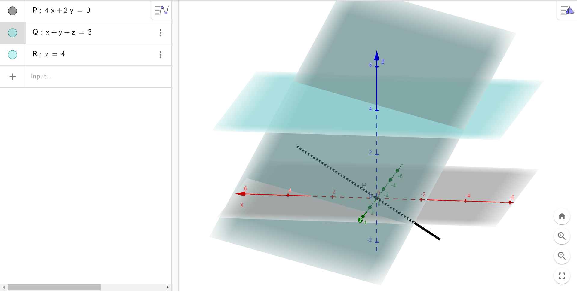 Sử dụng phần mềm GeoGebra để biểu diễn các mặt phẳng (P): 4x + 2y = 0, (Q): x + y + z = 3, (R): z = 4.