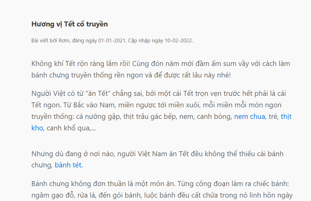 Ví dụ: khi em tìm hiểu về “Hương vị Tết cổ truyền” thì tại trang văn bản em thấy có phần “nem chua”, “thịt kho”, “bánh tét” có màu khác với các phần văn bản còn lại. Đó là một siêu liên kết, khi bấm vào sẽ dẫn em tới một trang web mới nói về các từ khác màu này.