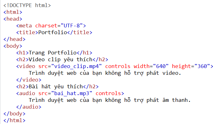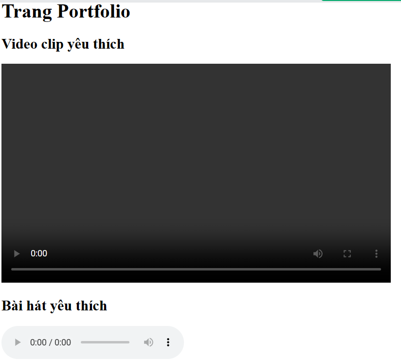 Dưới đây là đoạn mã HTML để bổ sung video clip và bài hát yêu thích vào trang web portfolio.html: