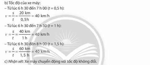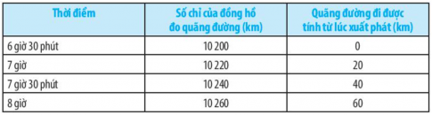 Bảng dưới đây cho biết số chỉ của đồng hồ đo quãng đường trên một xe máy tại các thời điểm khác nhau kể từ lúc xuất phát (6 giờ 30 phút).