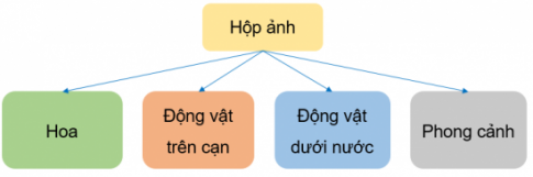 Em hãy sắp xếp các bức ảnh ở Hình 5 vào một hộp có bốn ngăn, để khi có thêm nhiều ảnh em vãn nhanh chóng tìm được bức ảnh cần thiết. Hãy mô tả sắp xếp phân loại của em bằng sơ đồ tương tự như sơ đồ trong Hoạt động 2.