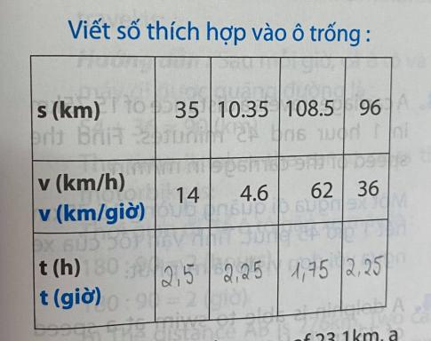 Cột 2: t = s : v = 10,35 : 4,6 = 2,25