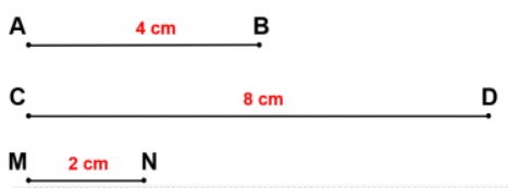 Vẽ đoạn thẳng AB dài 4cm. Vẽ đoạn thẳng CD dài gấp 2 lần đoạn AB. Vẽ đoạn thẳng MN dài bằng độ dài đoạn thẳng AB giảm đi 2 lần.