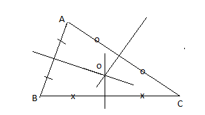 Cho hai đoạn thẳng AB = 2cm và BC = 3cm (góc ABC < $90^{\circ}$). Xác định giao điểm O của hai đường trung trực của đoạn thẳng AB và BC. | |