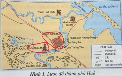 Vị trí của kinh thành Huế, chùa Thiên Mụ trên hình 1:
