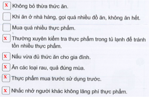 Câu 2. Hãy đánh dấu X vào những ô trước ý trả lời đúng. Những việc làm nào dưới đây giúp tránh lãng phí thức ăn, đồ uống được chế biến từ thực vật?