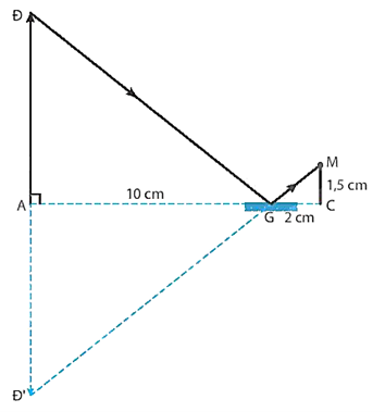 + Dựng CM = 1,5 cm biểu diễn khoảng cách từ chân đến mắt M 1,50 m. Nối GM được tia sáng phản xạ chiếu vào mắt.