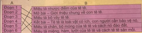 Nối từ Nối từ ngữ ở cột A với nội dung tương ứng ở cột B để có nội dung chính của các đoạn trong bài Con tê tê.