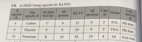 a) Một số thông tin (ô nguyên tố, chu kì, nhóm; là nguyên tố kim loại, phi kim hay khí hiếm) của những nguyên tố có số thứ tự lần lượt là 6, 9 và 19.