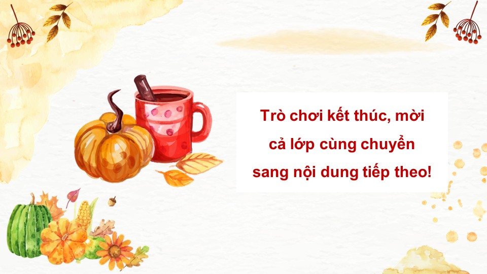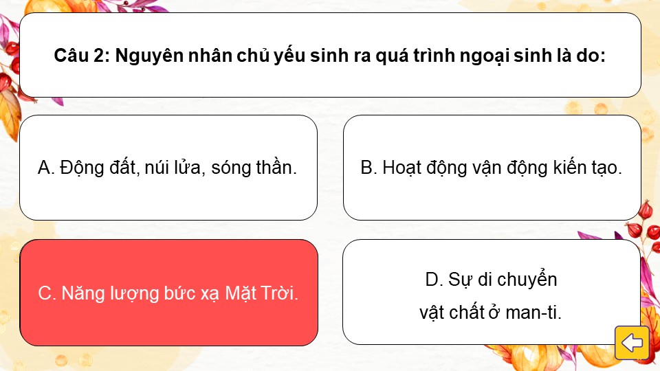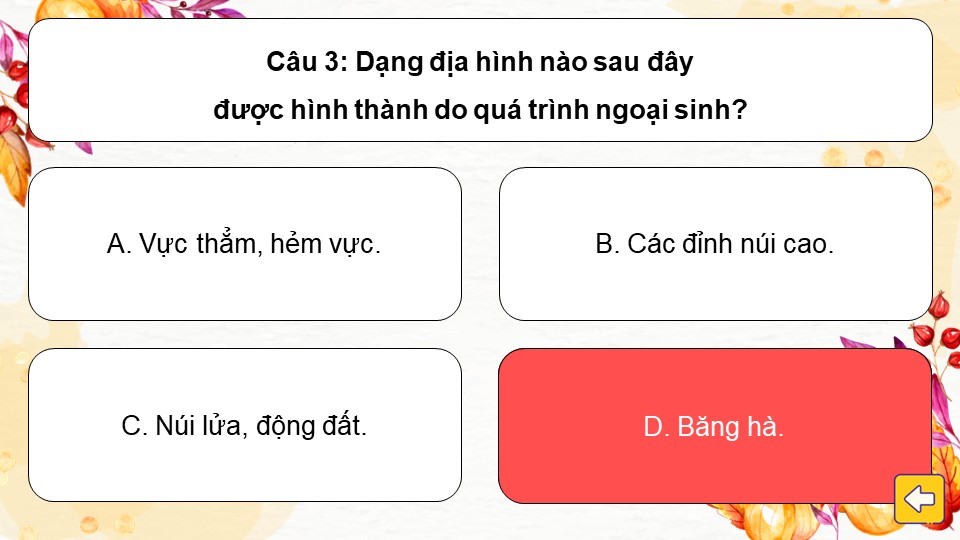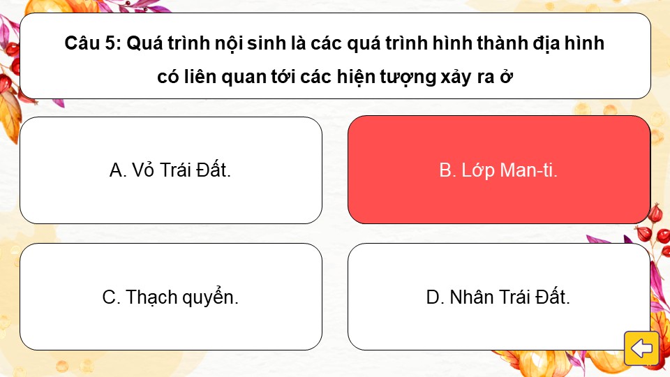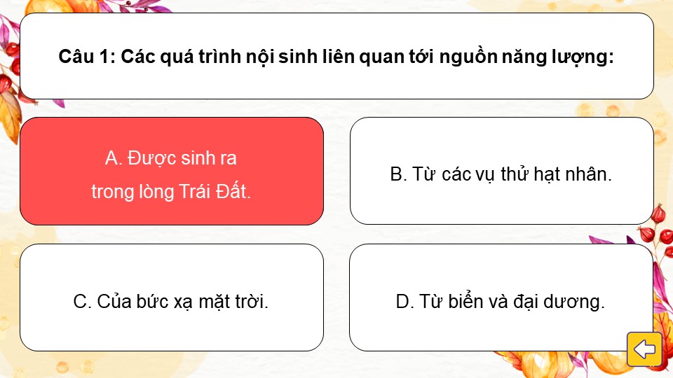 - Luật chơi: Chia lớp thành các đội. Mỗi chiếc lá là một câu hỏi trắc nghiệm. Học sinh chọn chiếc lá bất kỳ để nhận câu hỏi và trả lời. Trả lời đúng sẽ nhận được điểm. Đội nào được điểm cao nhất sẽ dành chiến thắng.