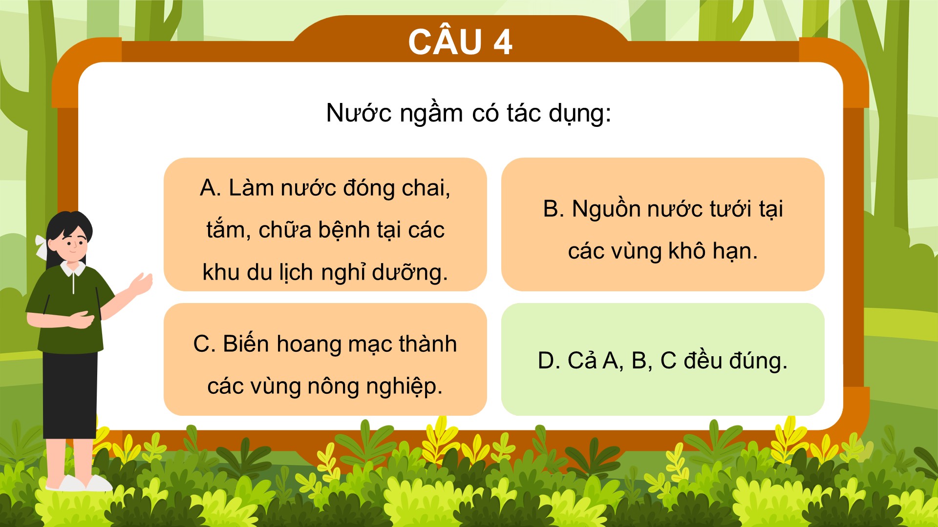- Luật chơi: Học sinh lần lượt chọn và trả lời các câu hỏi trắc nghiệm 4 đáp án. Mỗi câu đúng được tính một điểm, nhóm/cá nhân có nhiều điểm nhất sẽ giành chiến thắng.