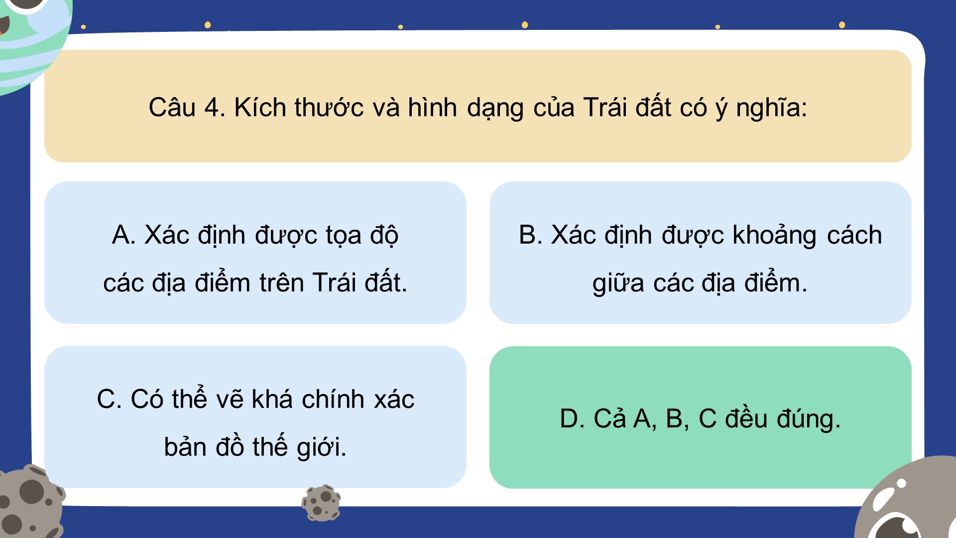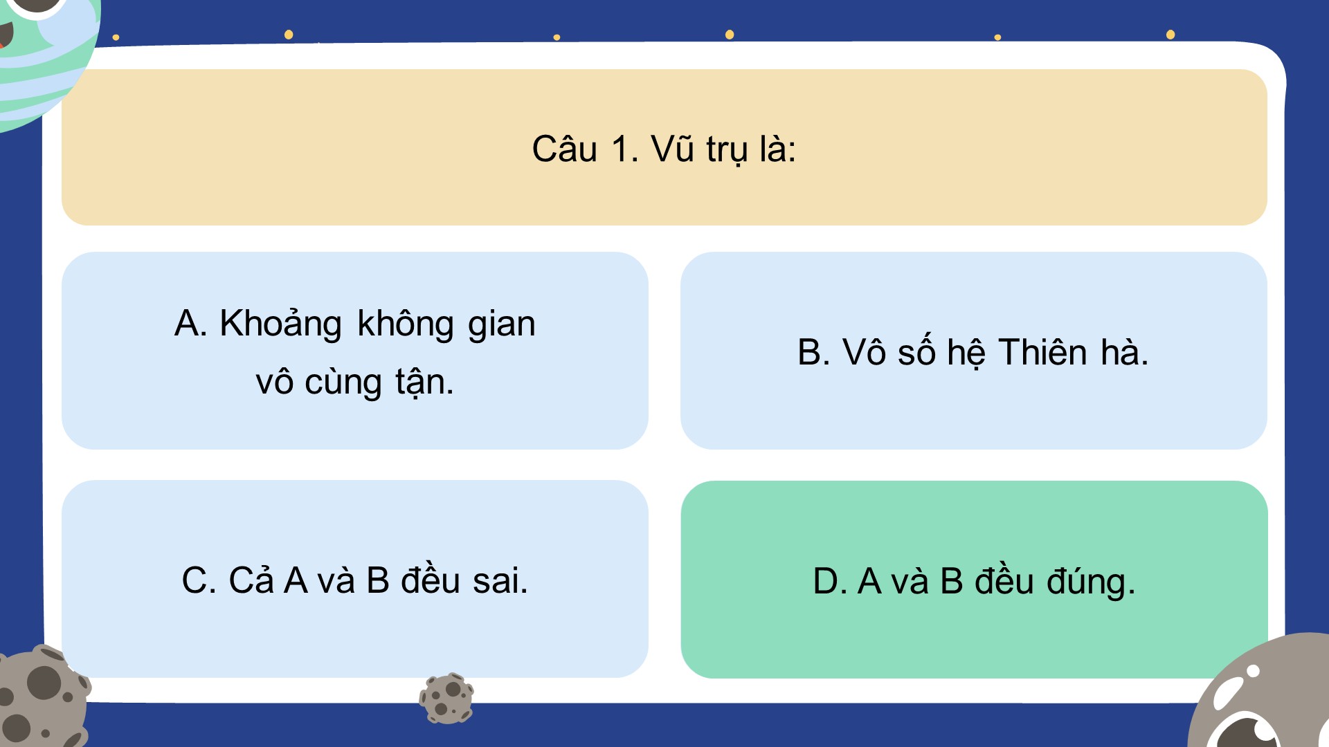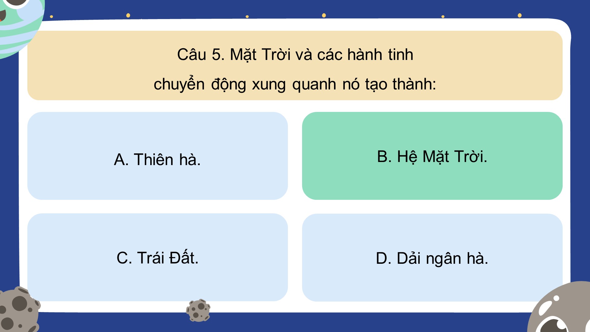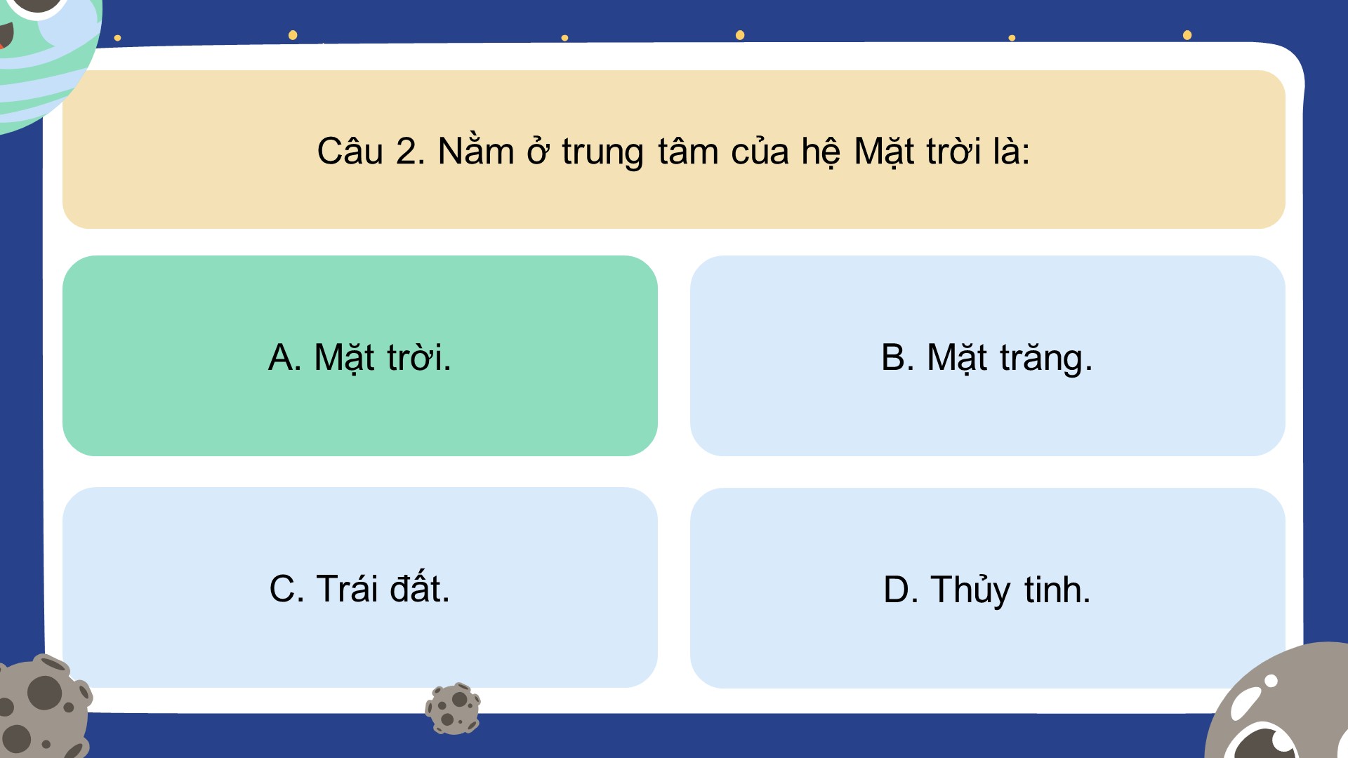 - Luật chơi: Học sinh trả lời các câu hỏi trắc nghiệm để mở khóa các hành tinh trong hệ Mặt Trời.
