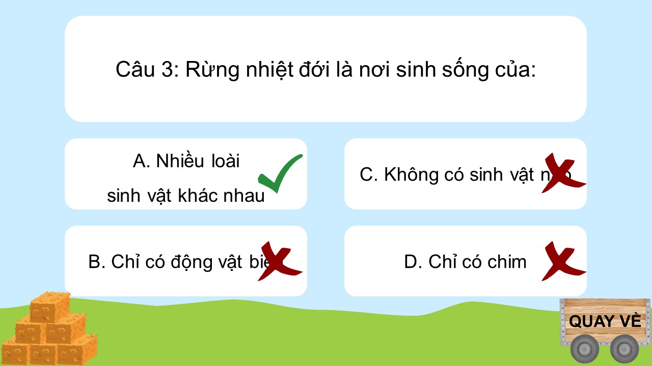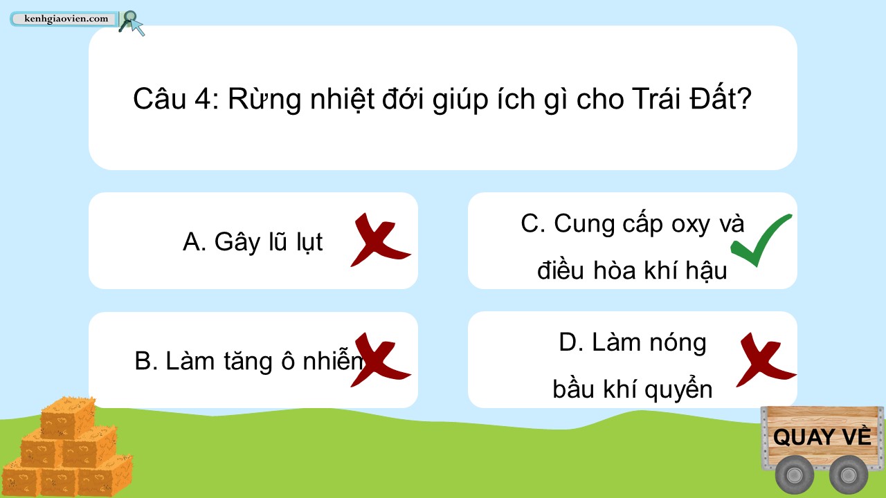 - Luật chơi: Trên cây có 6 quả cam, mỗi quả tương ứng với 1 câu hỏi trắc nghiệm. Học sinh lần lượt chọn quả cam để mở câu hỏi và trả lời. Mỗi câu trả lời đúng sẽ giúp hái được một quả cam trên cây.