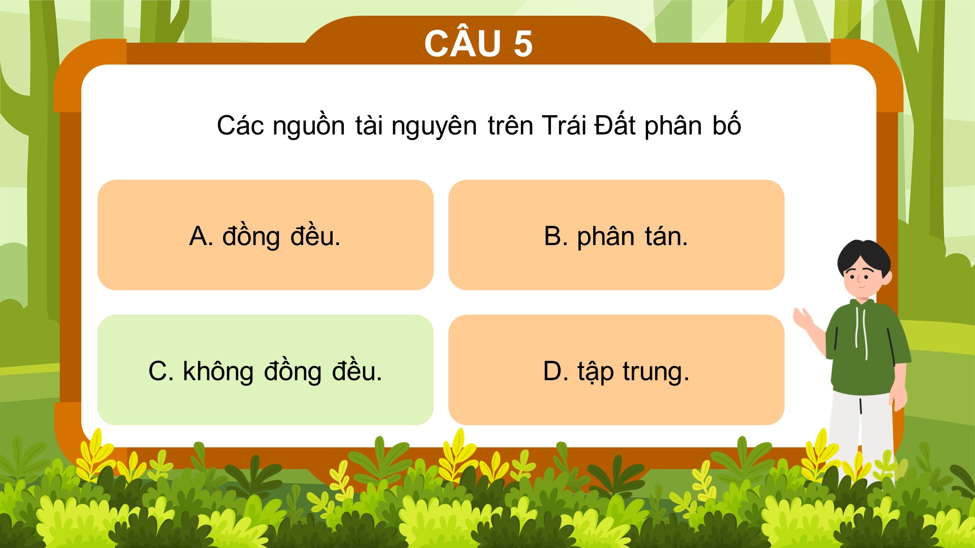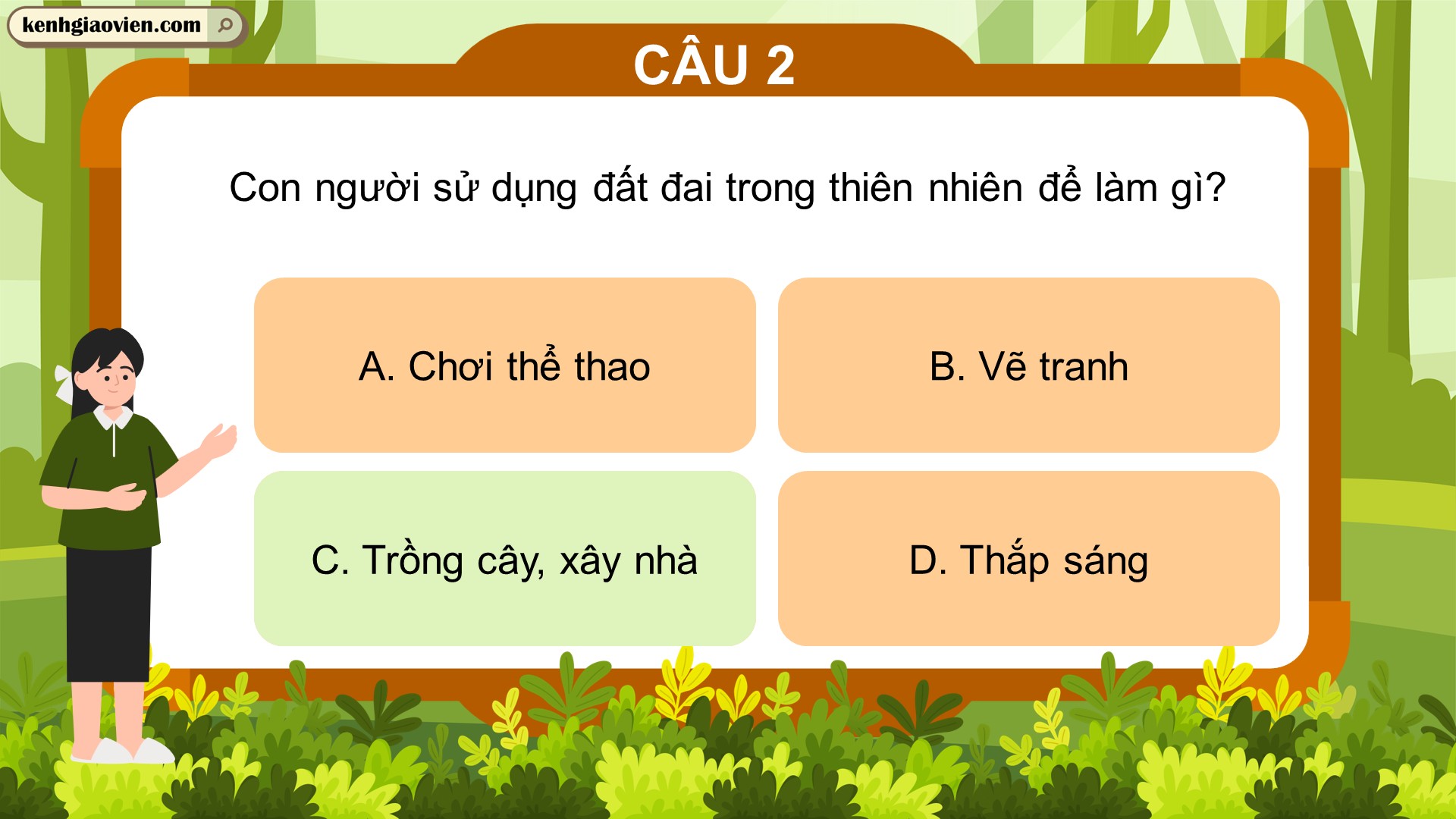 - Luật chơi: Học sinh lần lượt chọn và trả lời các câu hỏi trắc nghiệm 4 đáp án. Mỗi câu đúng được tính một điểm, nhóm/cá nhân có nhiều điểm nhất sẽ giành chiến thắng.