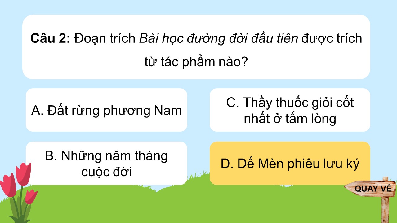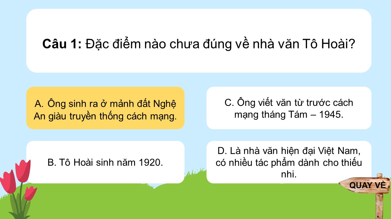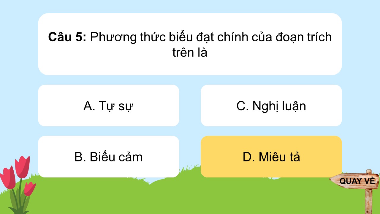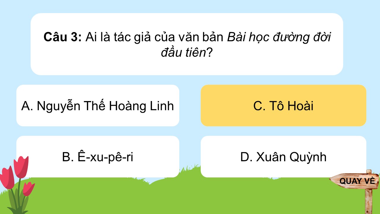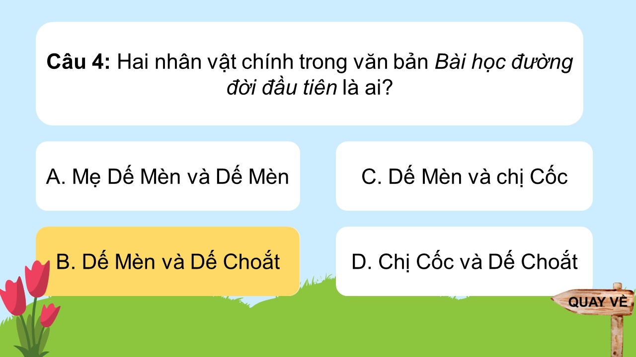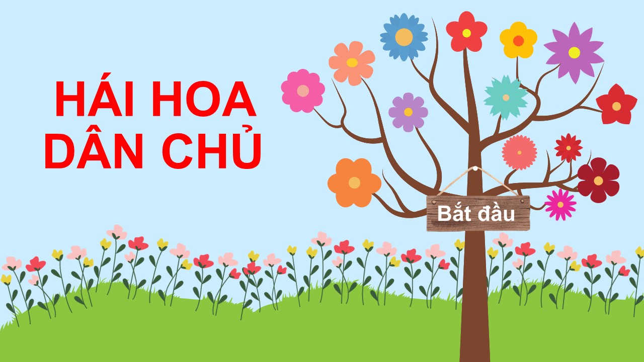 Luật chơi: Trò chơi gồm các câu hỏi trắc nghiệm với 4 đáp án A, B, C, D. Học sinh lần lượt chọn một bông hoa bất kỳ để mở câu hỏi bên trong. Sau khi đọc kỹ, các em chọn đáp án đúng nhất.