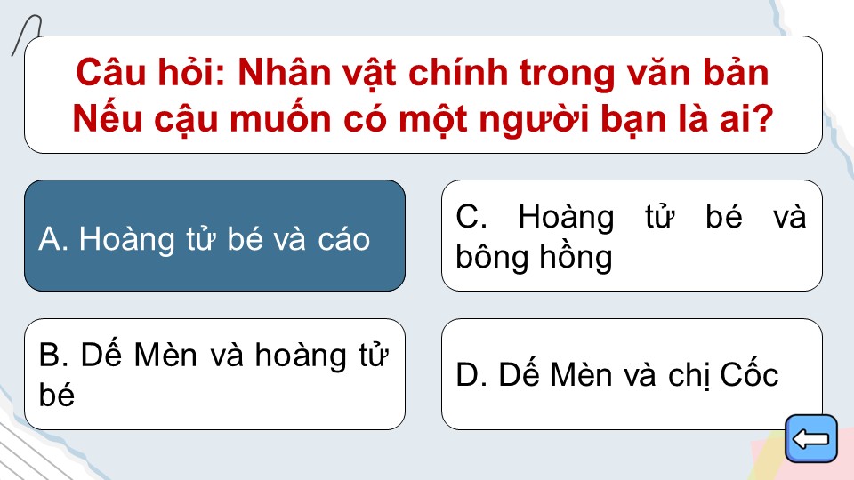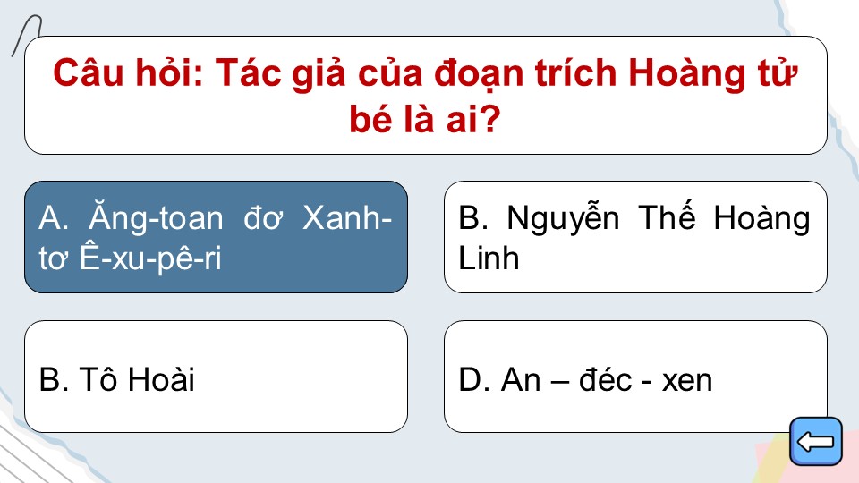 Luật chơi: Trò chơi gồm các ngôi sao cùng với câu hỏi trắc nghiệm 4 đáp án A, B, C, D. Học sinh lần lượt chọn một ngôi sao bất kỳ để mở câu hỏi bên trong. Sau khi đọc kỹ, các em chọn đáp án đúng nhất.