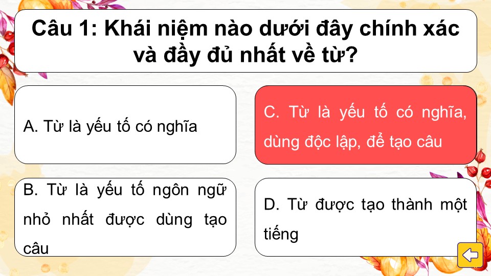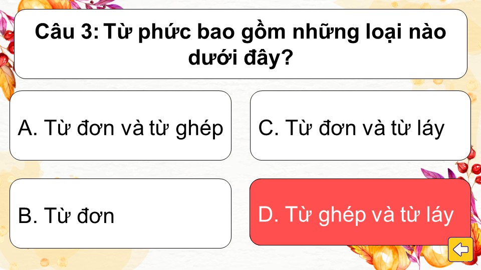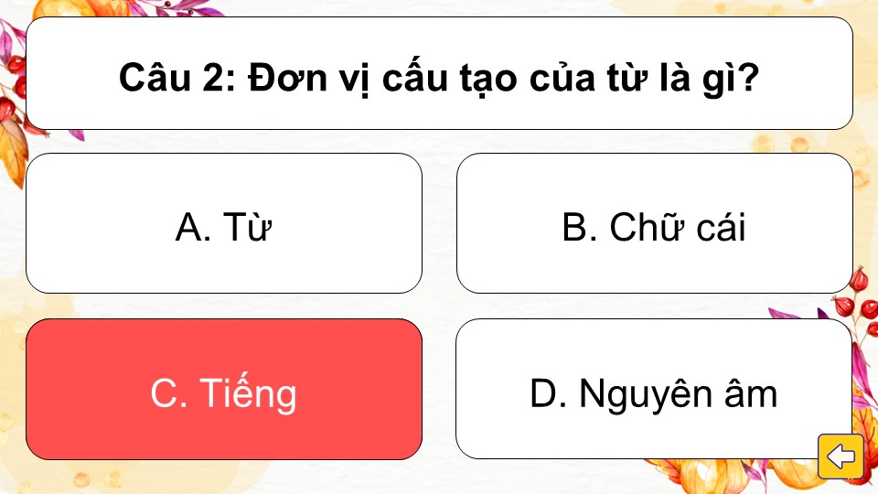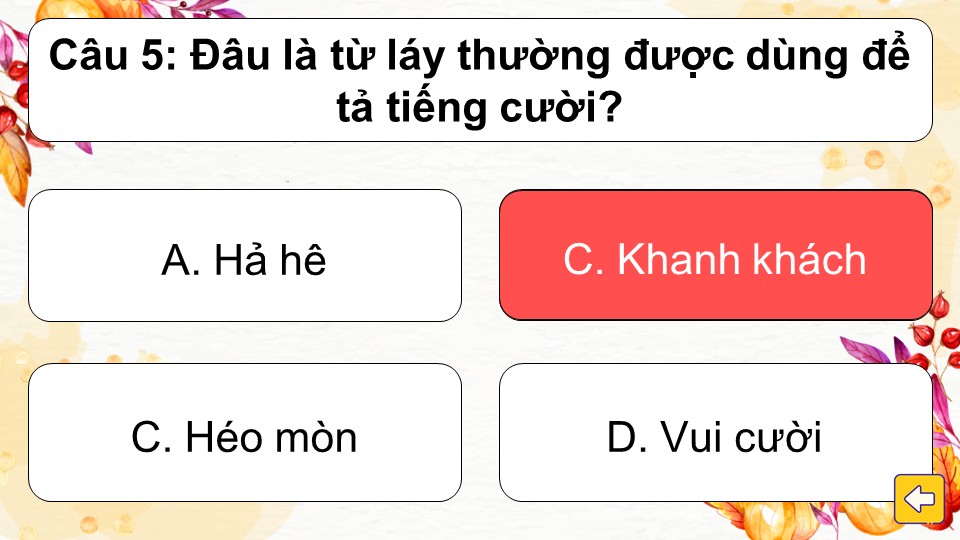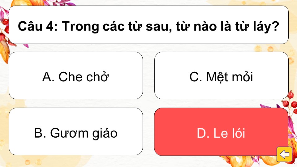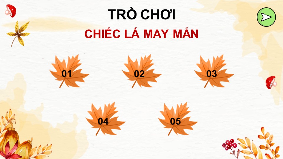 Luật chơi: Trò chơi gồm các câu hỏi trắc nghiệm với 4 đáp án A, B, C, D. Học sinh lần lượt chọn một chiếc lá bất kỳ để mở câu hỏi bên trong. Sau khi đọc kỹ, các em chọn đáp án đúng nhất.