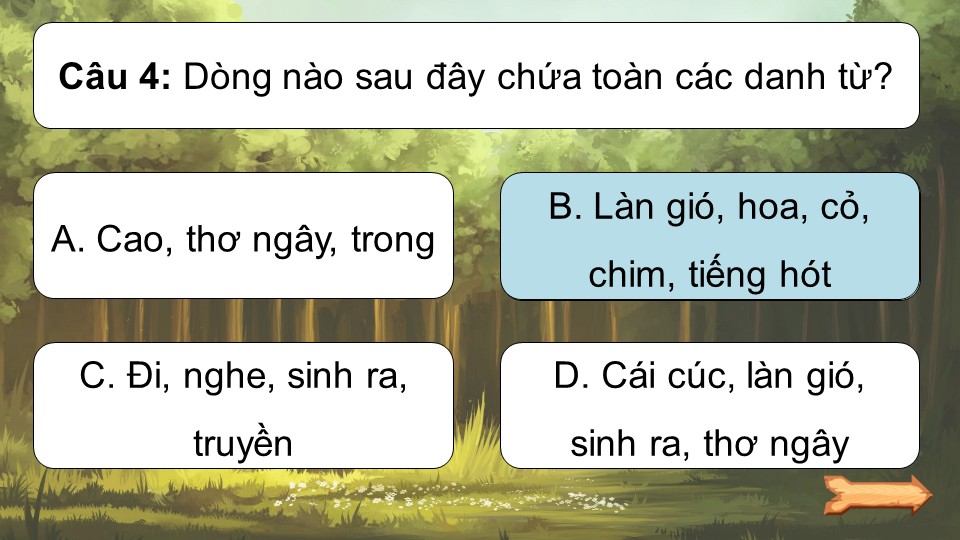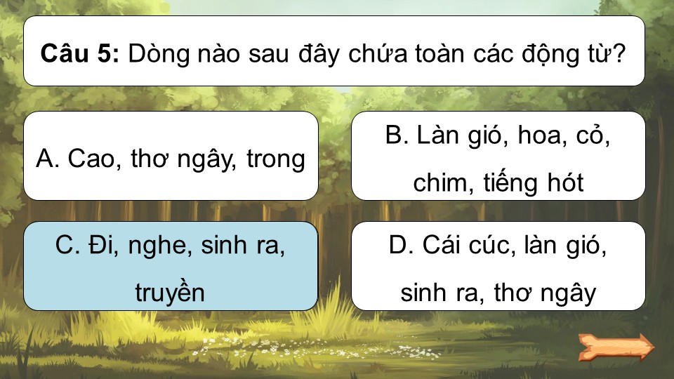 Luật chơi: Chia cả lớp thành 2 đội chơi. Có 5 câu hỏi, hai đội sẽ nhấn chuông để giành quyền trả lời. Hết 5 câu hỏi, đội nào trả lời đúng nhiều hơn sẽ chiến thắng.