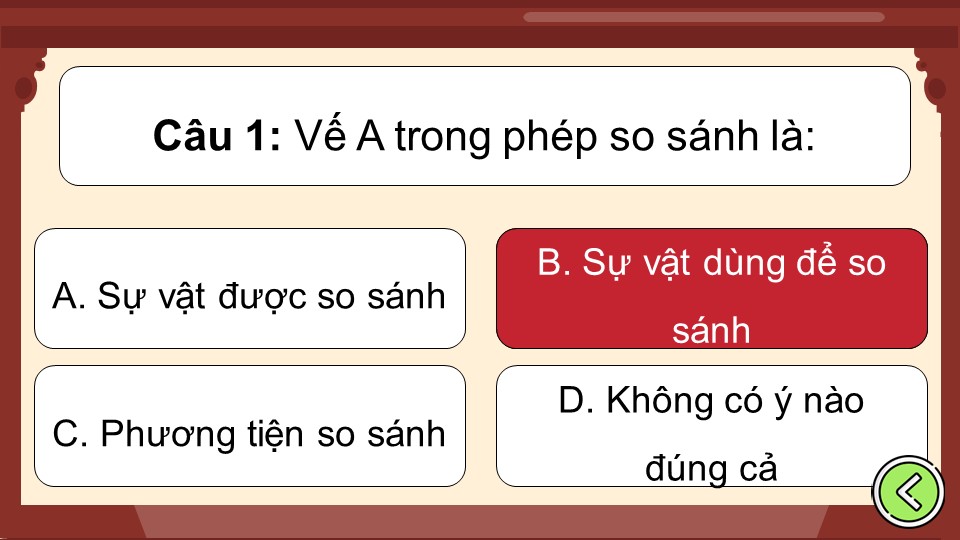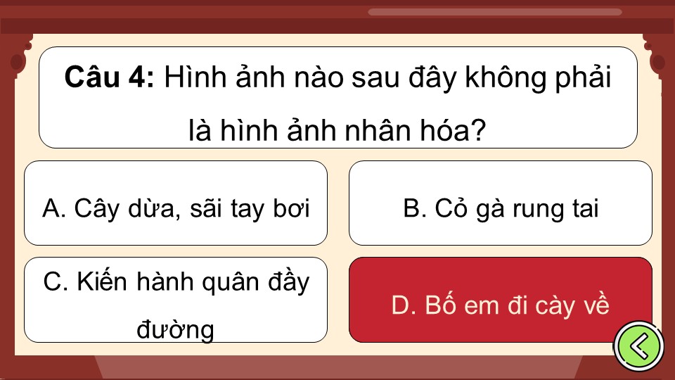 Luật chơi: Trò chơi gồm các quyển sách cùng với câu hỏi trắc nghiệm 4 đáp án A, B, C, D. Học sinh lần lượt chọn một quyển sách bất kỳ để mở câu hỏi bên trong. Sau khi đọc kỹ, các em chọn đáp án đúng nhất.