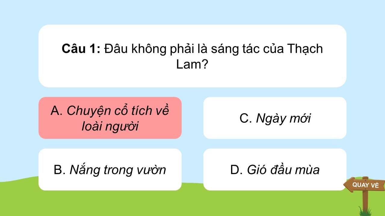 Luật chơi: Chọn một quả táo trên màn hình, mỗi quả chứa một câu hỏi trắc nghiệm A, B, C, D. Trả lời đúng được 1 điểm, sai không bị trừ điểm.