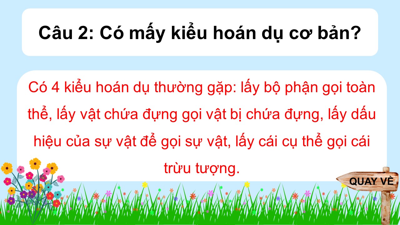 - Liệt kê các kiểu hoán dụ cơ bản trong tiếng Việt.