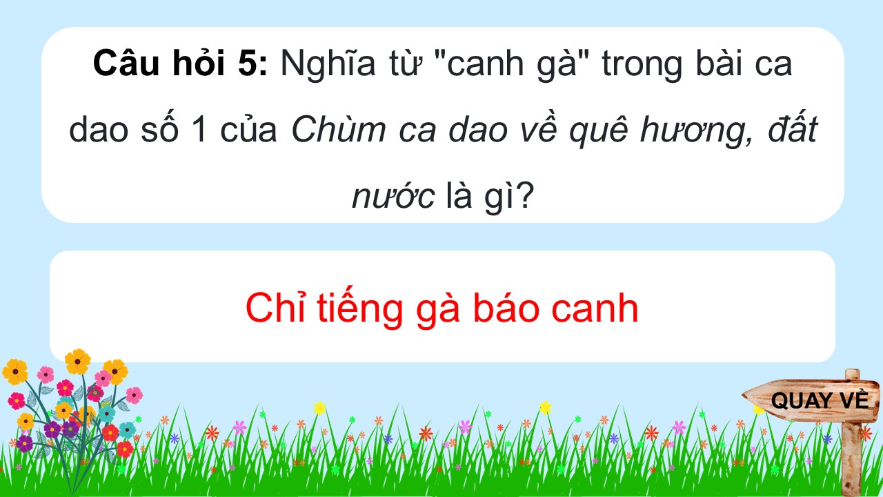 - Làm rõ nghĩa của từ "canh gà" trong bài ca dao số 1 thuộc Chùm ca dao về quê hương, đất nước.