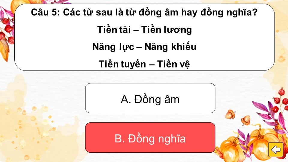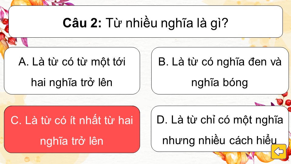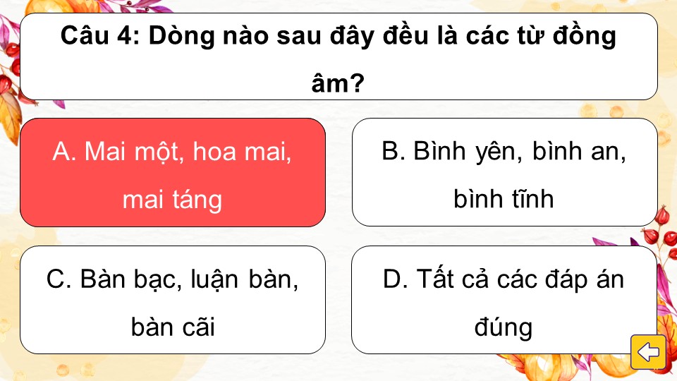 Luật chơi: Trò chơi gồm các chiếc lá cùng với câu hỏi trắc nghiệm 4 đáp án A, B, C, D. Học sinh lần lượt chọn một chiếc lá bất kỳ để mở câu hỏi bên trong. Sau khi đọc kỹ, các em chọn đáp án đúng nhất.
