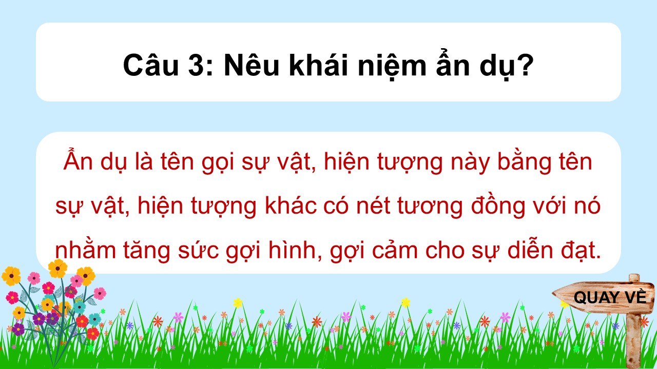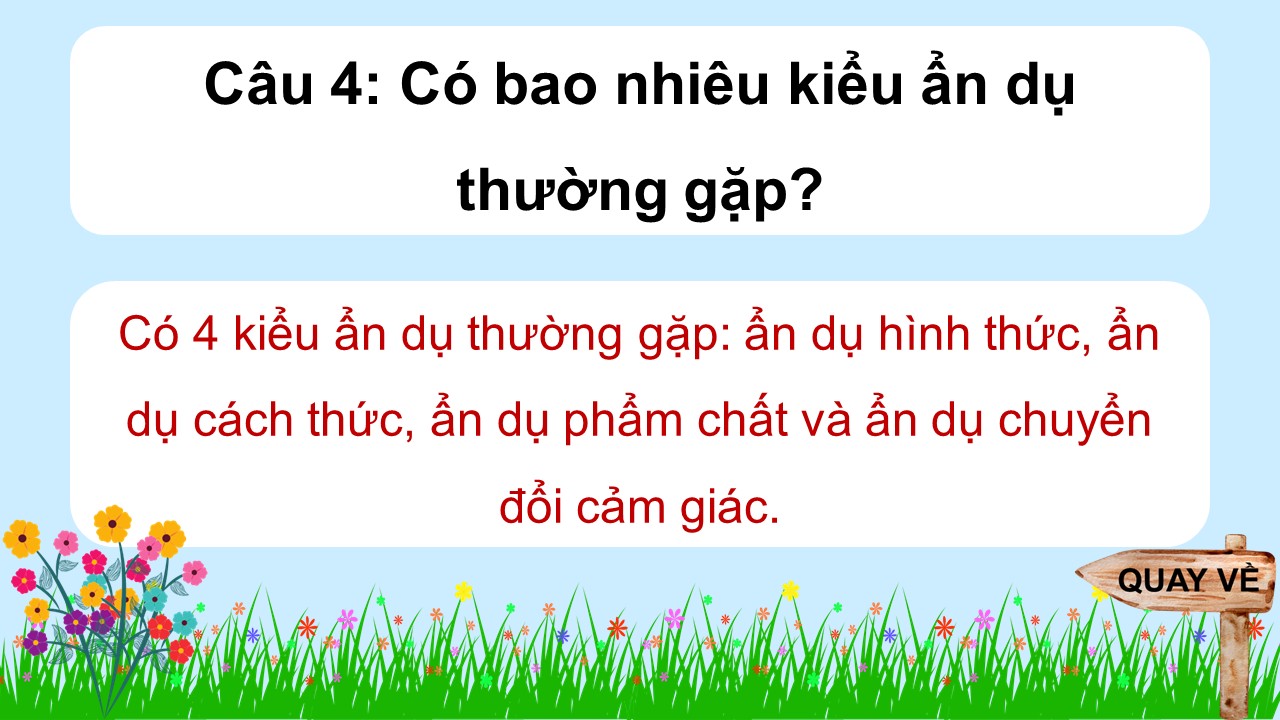- Nêu khái niệm ẩn dụ và liệt kê các kiểu ẩn dụ thường gặp.