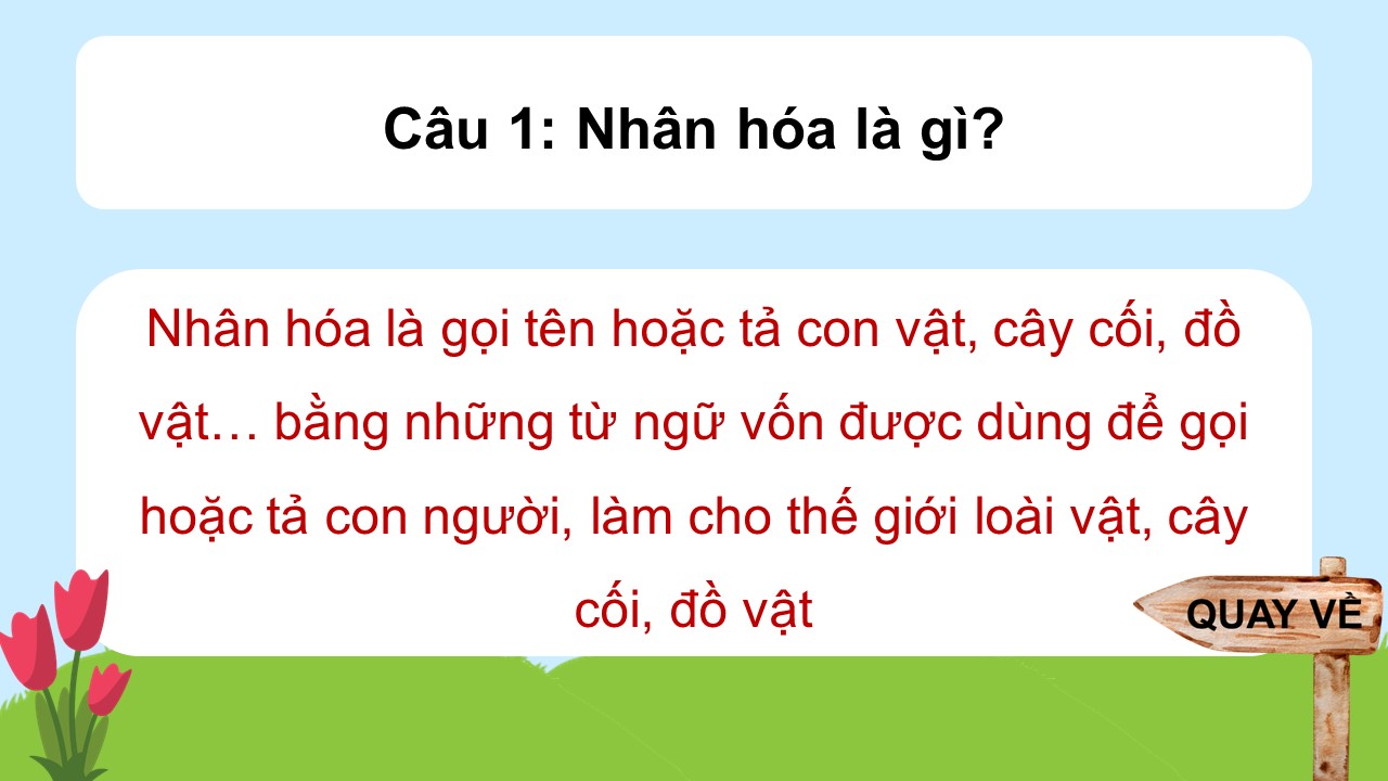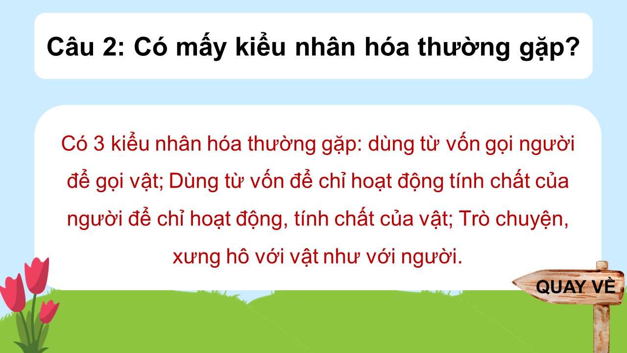 - Định nghĩa nhân hóa và liệt kê các kiểu nhân hóa thường gặp.