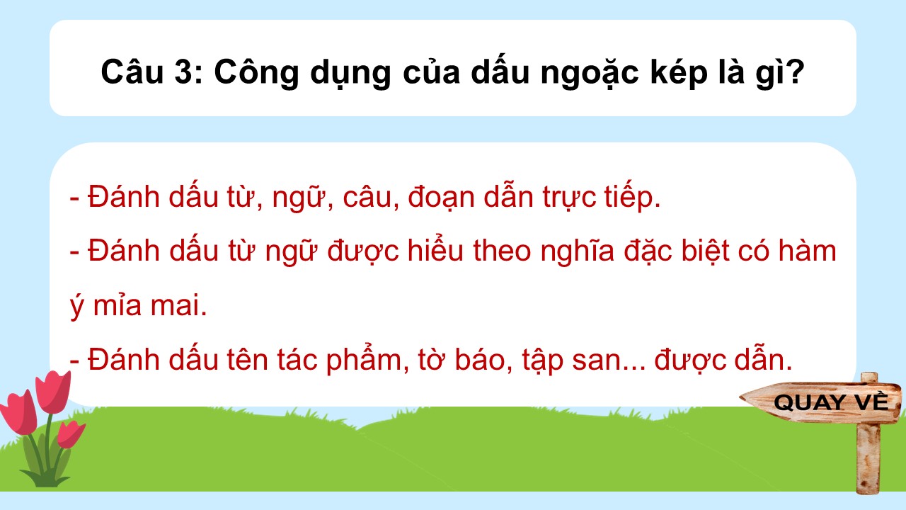 - Trình bày công dụng của dấu ngoặc kép trong câu văn.