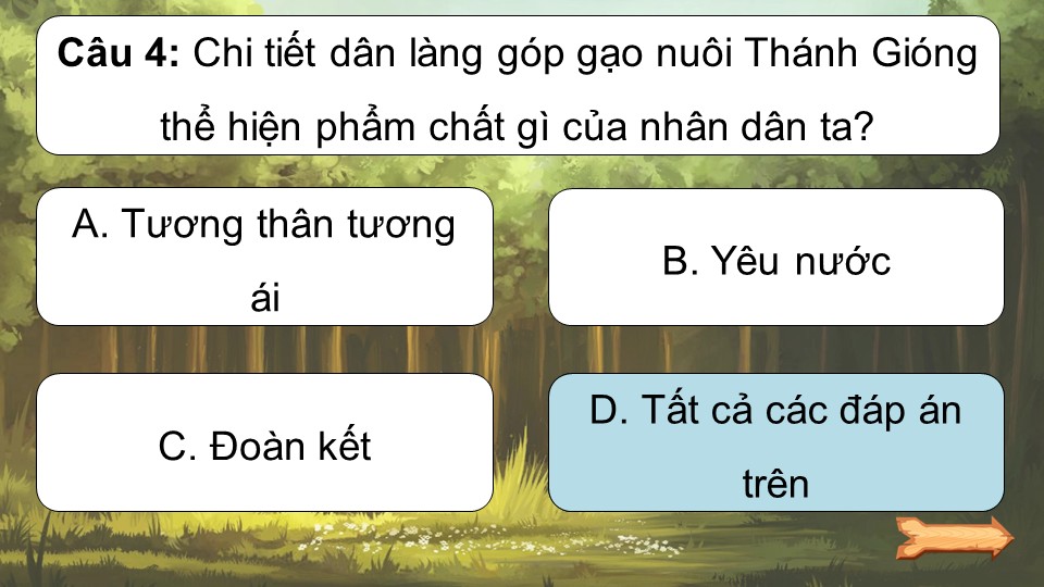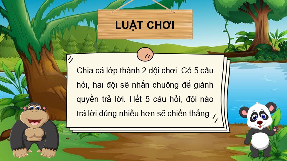 Luật chơi: Chia cả lớp thành 2 đội chơi. Có 5 câu hỏi, hai đội sẽ nhấn chuông để giành quyền trả lời. Hết 5 câu hỏi, đội nào trả lời đúng nhiều hơn sẽ chiến thắng.