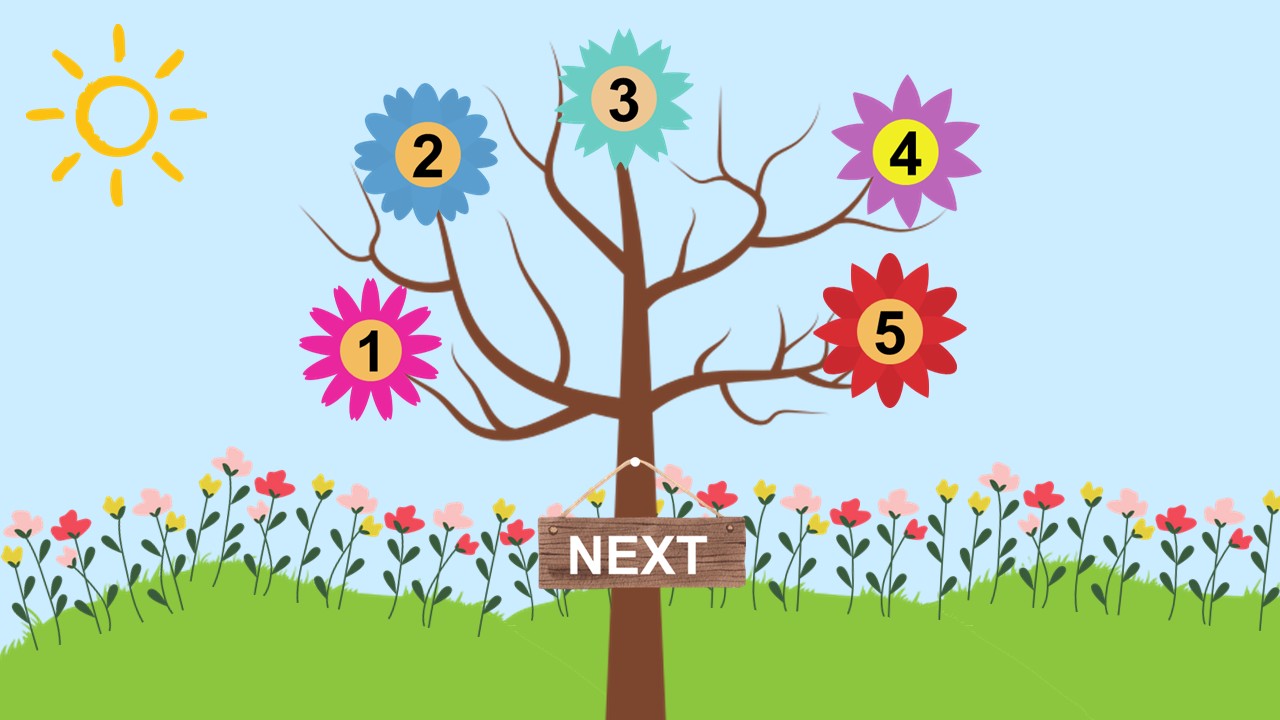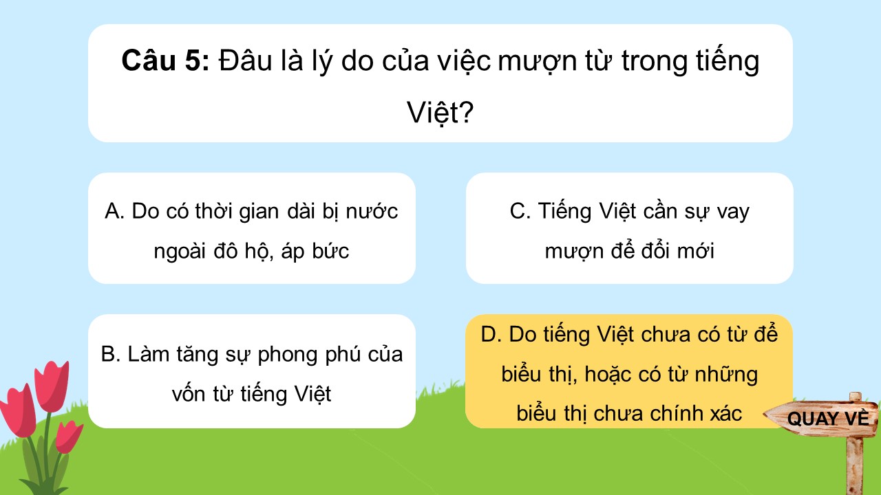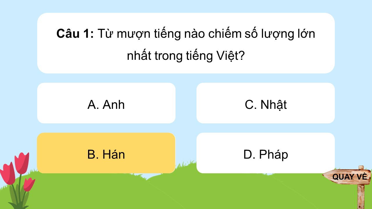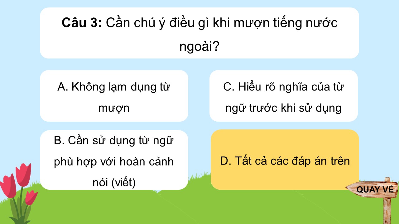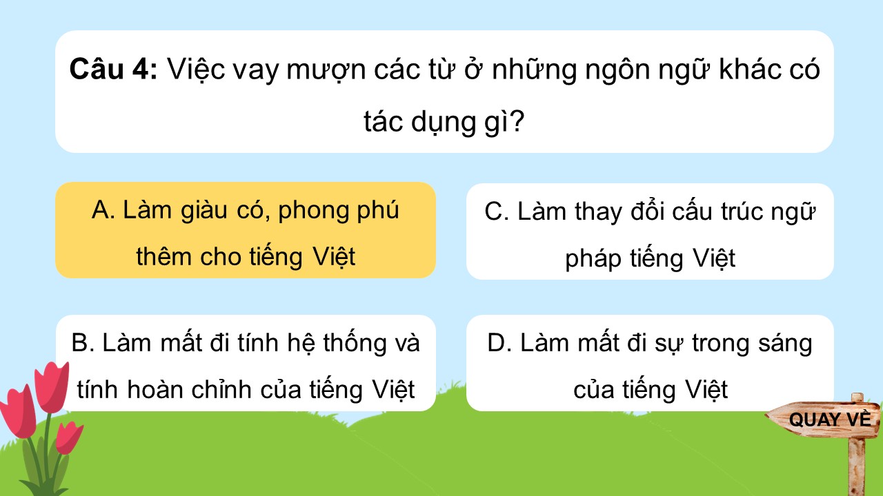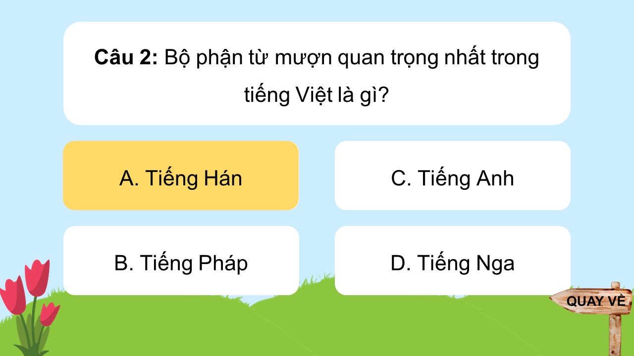 Luật chơi: Trò chơi gồm các câu hỏi trắc nghiệm với 4 đáp án A, B, C, D. Học sinh lần lượt chọn một bông hoa bất kỳ để mở câu hỏi bên trong. Sau khi đọc kỹ, các em chọn đáp án đúng nhất.