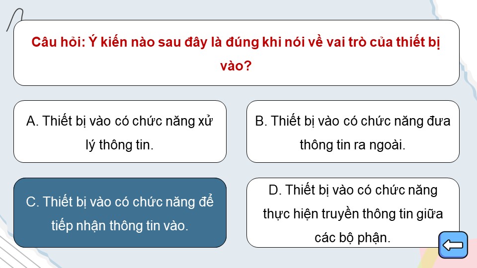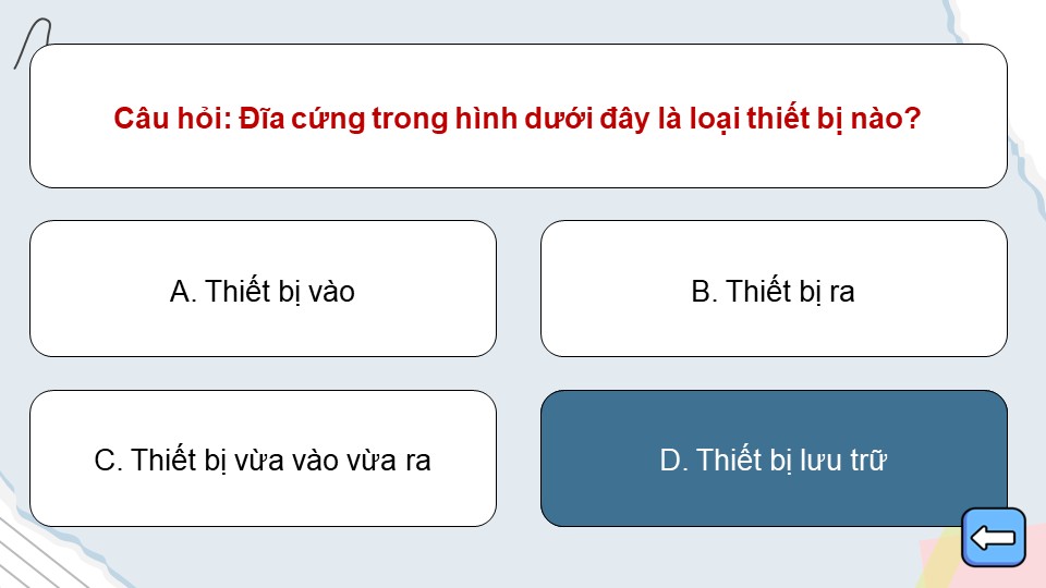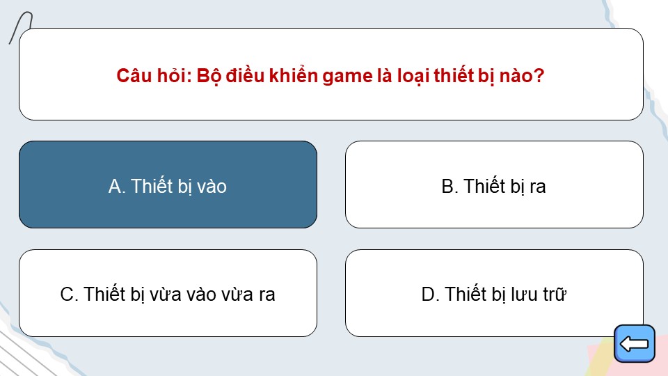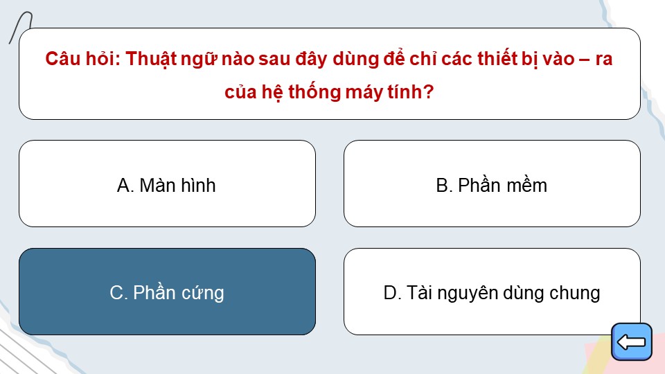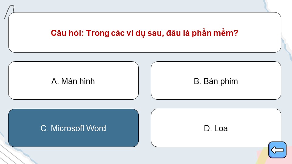 - Nội dung kiến thức: Trò chơi bao gồm các câu hỏi trắc nghiệm về kiến thức tin học cơ bản như: