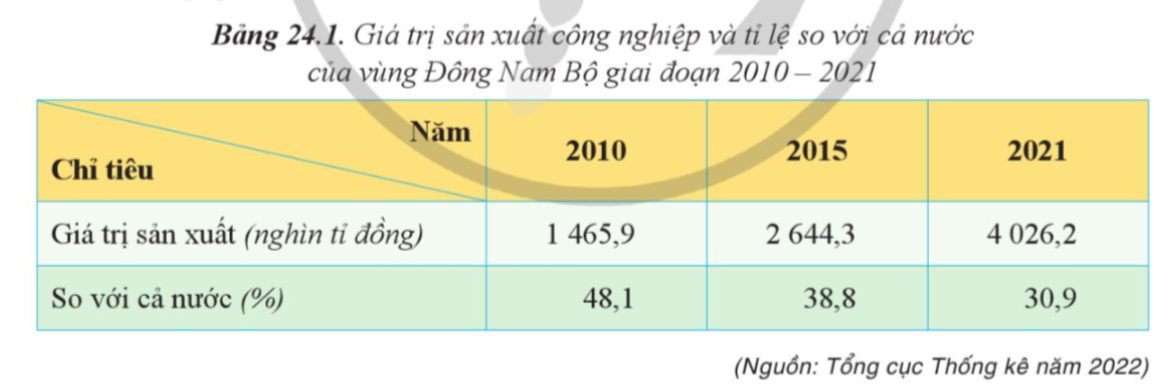 Câu 1: Dựa vào bảng 24.1, hãy nhận xét về sự thay đổi giá trị sản xuất công nghiệp của vùng Đông Nam Bộ.