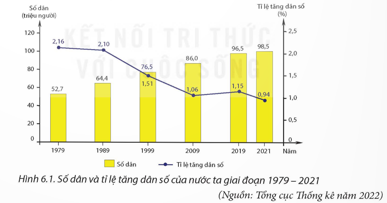 Câu hỏi: Dựa vào hình 6.1, hãy nhận xét và giải thích sự biến động số dân và tỉ lệ tăng dân số của nước ta giai đoạn 1979 – 2021.