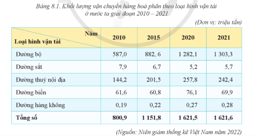 Câu 1: Dựa vào bảng 8.1, hãy nhận xét cơ cấu khối lượng vận chuyển hàng hoá phân theo loại hình vận tải ở nước ta giai đoạn 2010-2021.