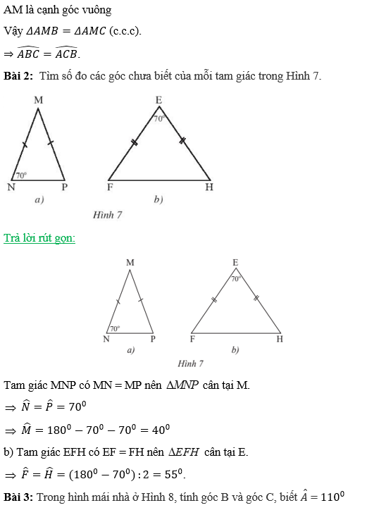 Bài 1: Cho tam giác cân ABC cân tại A (Hình 5). Gọi M là trung điểm cạnh BC. Nối A với M. Em hãy làm theo gợi ý sau để chứng minh…